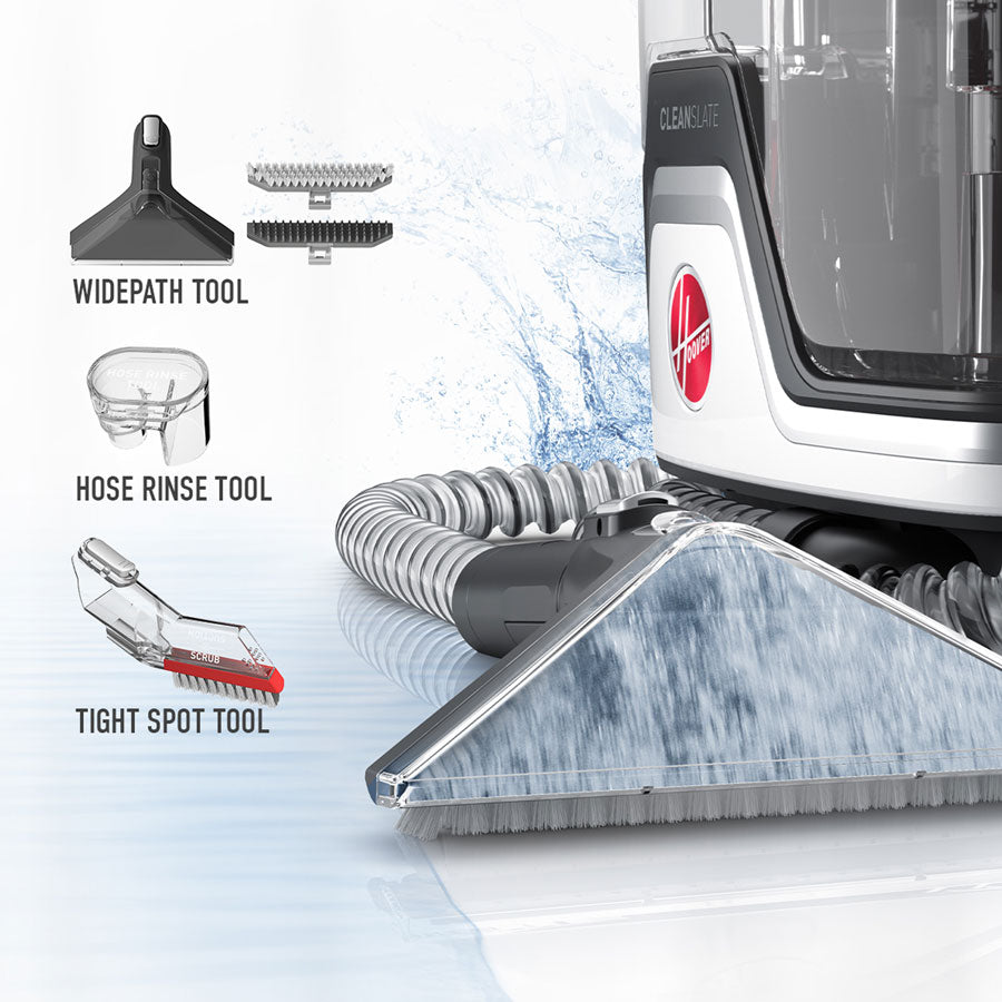 CleanSlate incorporates new features to deep clean the most challenging messes including a variety of tools such as the 7??Ñ WidePath tool for larger messes and stains, a hose rinse tool that flushes any left behind dirt, and Hoover???s Oxy Carpet Cleaning Formula that oxidizes and permanently removes tough stains and neutralizes odors using odor counteracting technology.